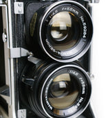 Tauche ein in die Welt der Mittelformatfotografie mit dem Mamiya C220 Twin-Lens Reflex Kamera-Set, das mit dem Mamiya-Sekor 55mm F4.5 Objektiv und dem Mamiya-Sekor 180mm F4.5 Objektiv ausgestattet ist.